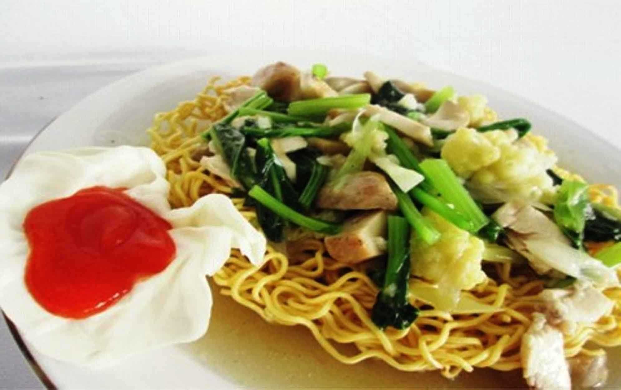 Mie Kering yang dimasak dengan seafood, jamur, brokoli, jagung manis dan disiram dengan kuah yang lezat khas trisula